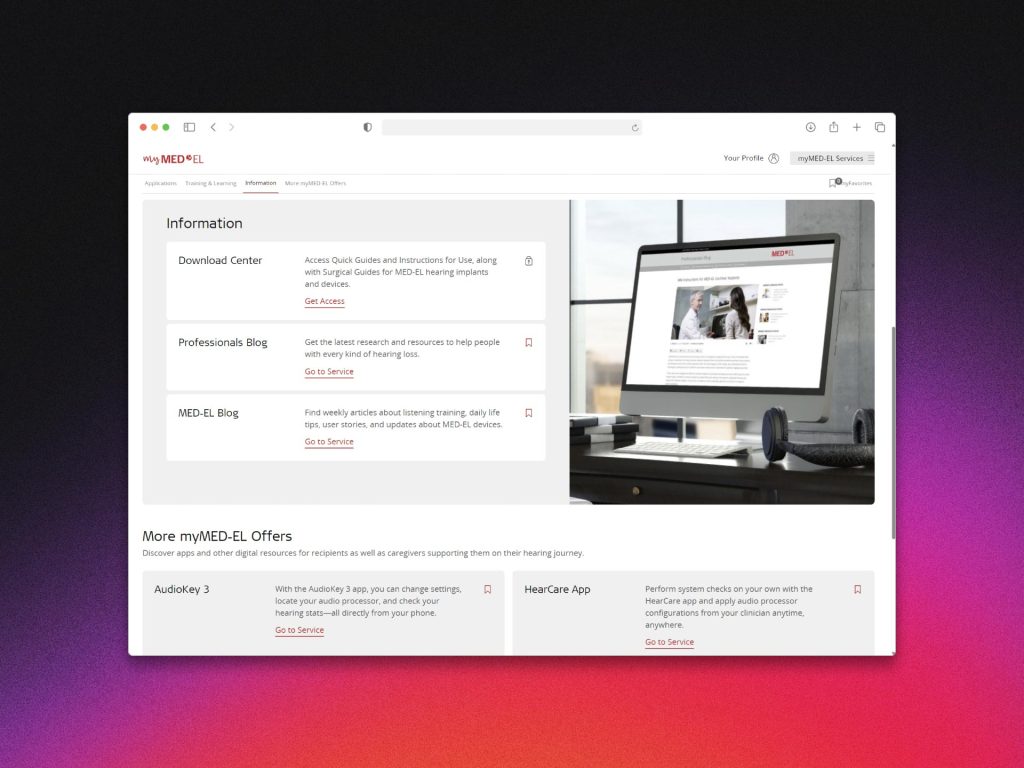 Between January 2013 and August 2015, I worked on the redesign and consolidation of the myMED-EL for Professionals portal ~ a secure platform designed for audiologists, surgeons, and clinical partners supporting cochlear implant users. My role as the lead designer (CX / UI and UX were emerging terms at the time) involved rethinking how healthcare professionals accessed training, downloaded critical software like MAESTRO, and navigated MED-EL’s vast resource ecosystem. There was no previous system and we had fragmented touchpoints, slow onboarding, and a plethora of support requests.