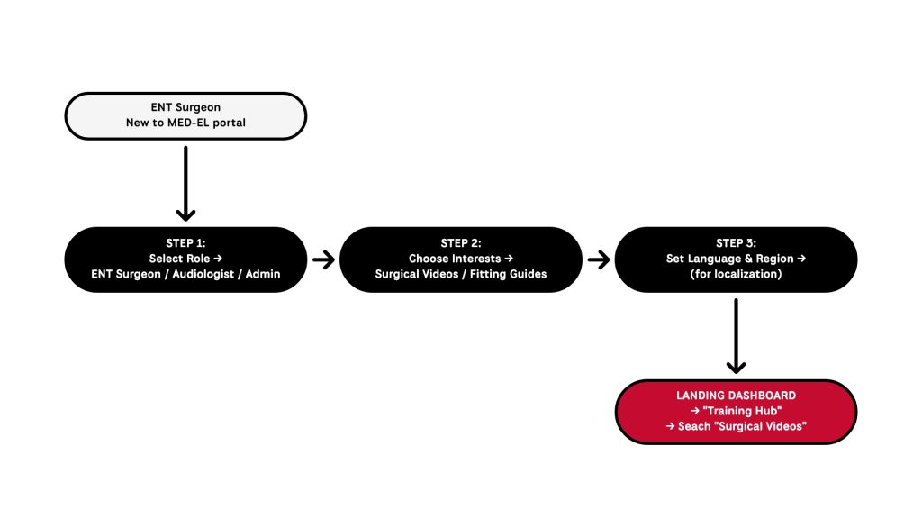 We also ran a simple card-sorting exercise to reorganize resources in a way that aligned with how professionals thought, not just how the business categorized them. I mapped out key user journeys for different roles ~ from the solo audiologist in a private clinic to large institutions with shared logins ~ and identified early on the need for role-based access, localization, and streamlined onboarding. This foundational research became the backbone for how we structured the experience moving forward.
