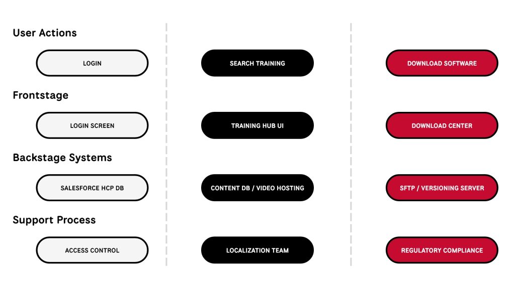 With a clearer understanding of our users, the focus shifted to mapping out how each role ~ audiologists, clinic admins, and MED-EL trainers ~ would move through the system. I created light personas and corresponding user journeys to align interface priorities with real-world tasks. We mapped the service blueprint to identify not only front-end flows but also how backstage systems (Salesforce, SFTP, regulatory content, and training systems) connected to the user experience. This alignment ensured every visible interaction had solid infrastructure behind it.
