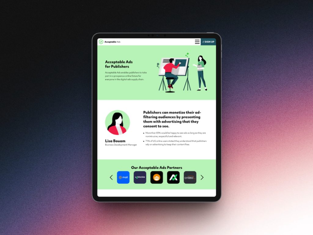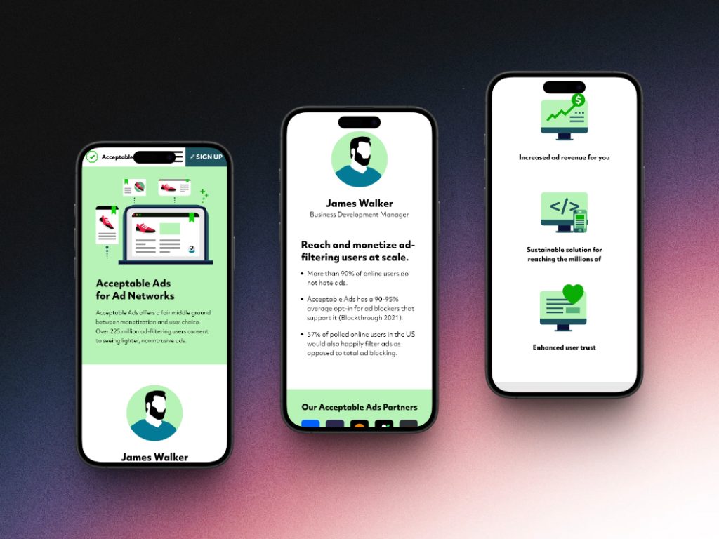The final result is a lean, focused site that reflects the principles of the Acceptable Ads initiative through visuals as much as messaging. Illustrations tell the story of user empowerment and responsible ad practices without clutter or jargon. The typography system, spacing rhythm, and UI components were refined to maintain legibility across screen sizes.