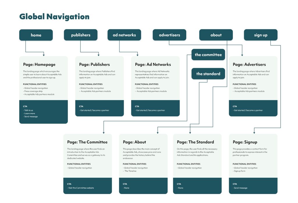 Each page was designed with multiple personas in mind: advertisers, browser partners, and ad-filtering users. Every element—from CTAs to footers—was built to reinforce transparency and simplicity.